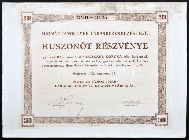 Budapest 1923. "Molnár János Imre Lakberendezési Részvénytársaság" 25 részvénye egyenként 1000K-ról szelvényekkel T:II hajtatlan, szennyezett