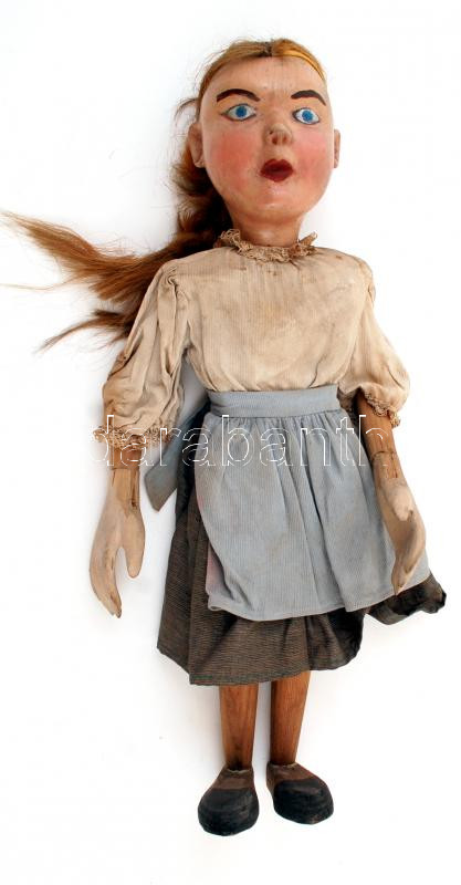 Antik Minerva baba, cellulóz fejű, fa testű, 45cm