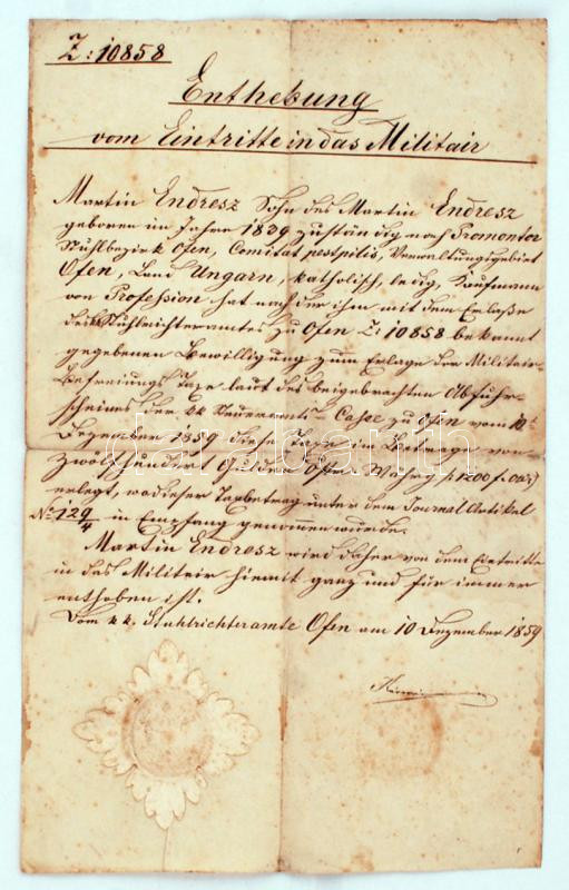 1859 A budai cs. kir. szolgabíróság igazolása Martin Endresz promontori (ma: Budafok) lakos részére katonaságba való belépésről, szárazpecséttel