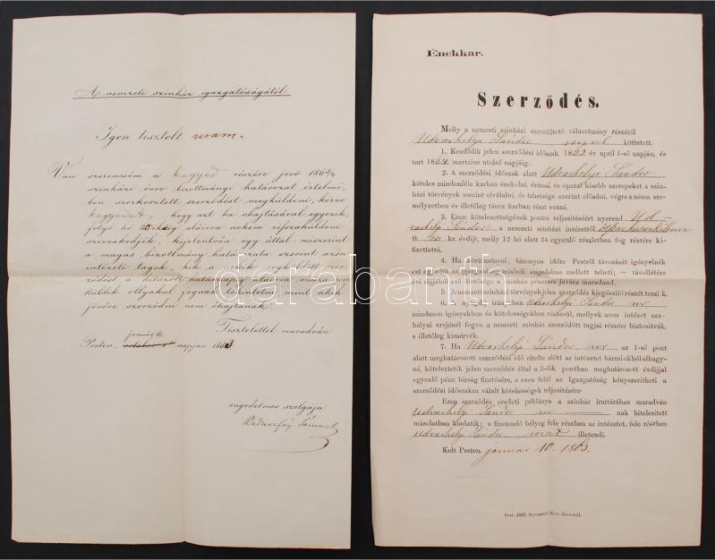 1863 Radnótfáy Nagy Sámuel (1803-1869) udvari tanácsos, a Nemzeti Színház intendánsa (1862-1869) kézzel írt levele Udvarhelyi Sándor (1815-1885) színész, énekes részére a következő színházi évre szóló szerződés megküldéséről, mellékelve a szerződés maga, levélben, rányomott viasz zárópecséttel /