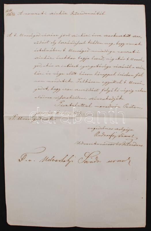 1865 The handwritten letter of Sámuel Radnótfáy Nagy (1803-1869) court councillor, the intendant of the National Theatre (1862-1869) sent to the Hungarian actor and singer Sándor Udvarhelyi (1815-1885) about the sending of his contraction for the next theatrical year