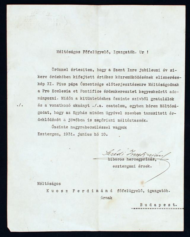 1931 Esztergom, Serédi Jusztinián (1884-1945) hercegprímás gépelt leve... https://www.darabanth.com/en/236-Online-auction/236.0/Other-collectibles/Historical-documents-manuscripts~400033/1931-Esztergom-Seredi-Jusztinian-1884-1945-hercegprimas-gepelt-levele-Kuosz-Ferdinand-fofe~II1089510