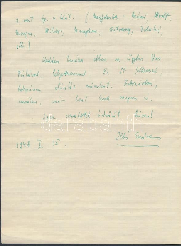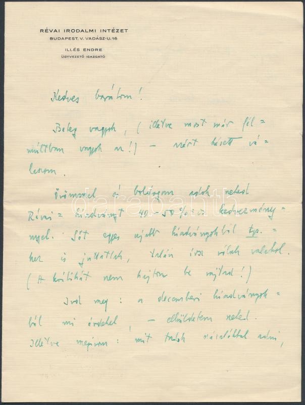 1948 Bp., Illés Endre (1902-1986) drámaíró, könyvkiadó igazgató kézzel írt levele Égly Antalnak