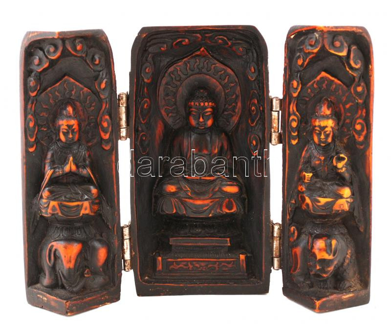 3 Buddha szobor együttes műanyag összecsukható tokban, 15x18cm