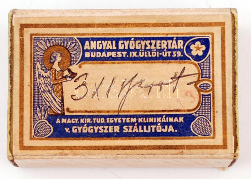 https://www.darabanth.com/en/237-Online-auction/237.0/Other-collectibles/Advertisement~200025/Az-Angyal-Gyogyszertar-Bp-IX-Ulloi-ut-39-gyogyszertaranak-papirdoboza-8x5x2-5-cm~II1094226