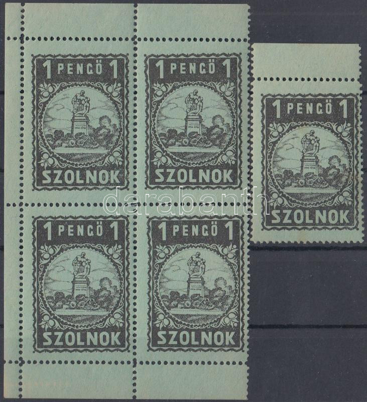 1930 Szolnok 1P bélyeg + négyestömb városi okmánybélyeg