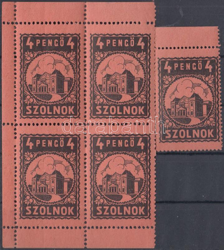 1930 Szolnok 4P bélyeg + négyestömb városi okmánybélyeg