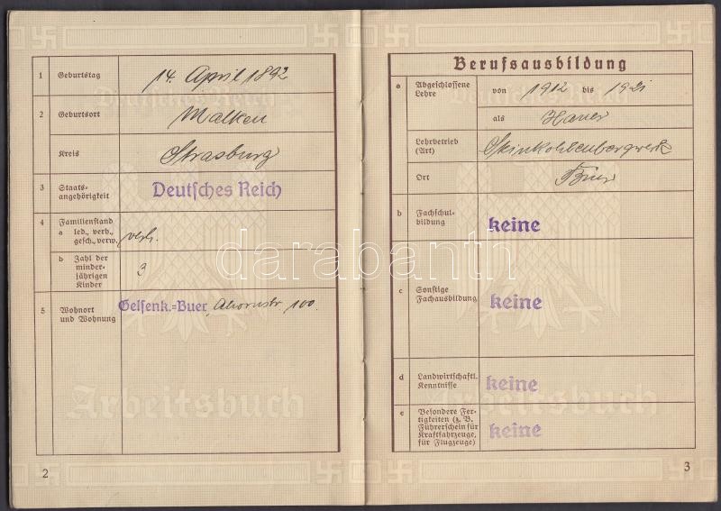1936 Deutsches Reich Arbeitsbuch, kitöltött német birodalmi munkakönyv...
