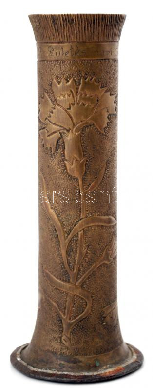 1960 gazdagon díszített réz "emlék" töltényhüvely váza, réz, m:20 cm