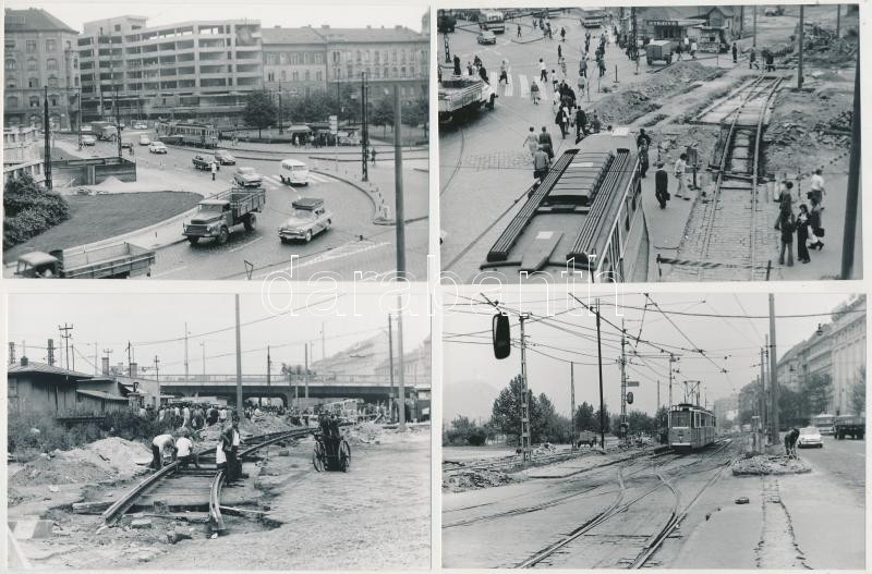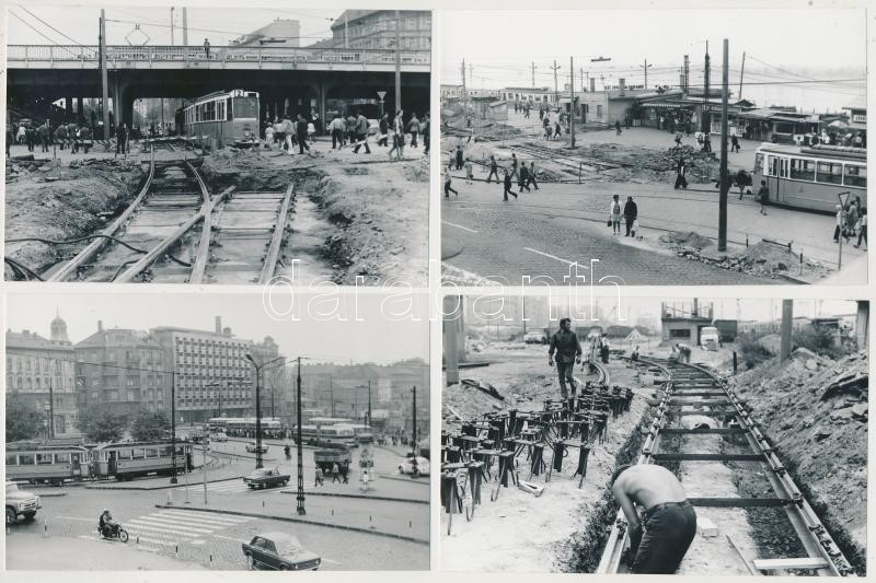 Description: 1973 Budapest, város- és közlekedéstörténeti fotók a Boráros térről, busz, HÉV és villamos végállomások, a 2-es villamos pályájának meghosszabbítása, átépítés, korszerűsítés, 13 db fotó, 9x14 cm