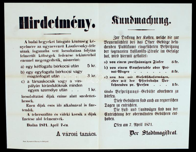 1871 Buda, A városi tanács által kiadott német-magyar nyelvű hirdetmény, melyben engedélyezik locsoltatási díj szedését