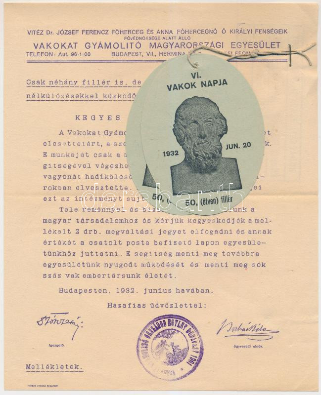 Description: 1932 Bp., A József Főherceg és Anna főhercegnő fővédnöksége alatt álló Vakokat Gyámolító Országos Egyesület levele, melyben támogatást kérnek a háborús veszteségek miatt a vakok megsegítésére, 2 db jeggyel