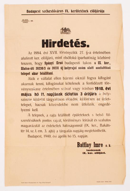 Description: 1940 Bp.IX., Budapest székesfőváros IX. kerületének elöljárója által kiadott hirdetés a Spányi Ernő által létesíteni kívánt aszfaltfőző telepről, 47x32 cm