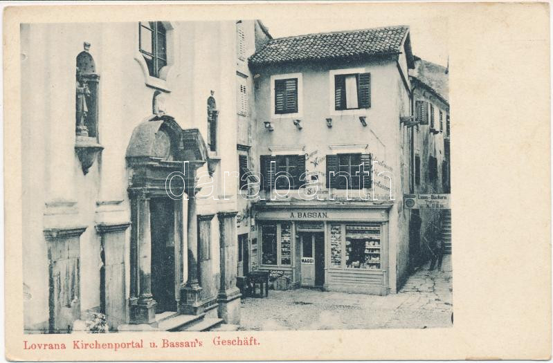 Lovran, Kirchenportal und Bassan's Geschäft / porch, shop (EK)