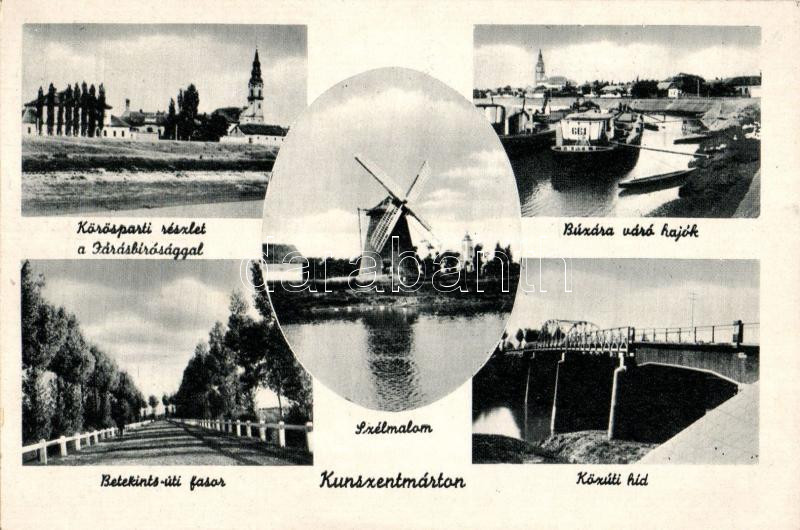 Kunszentmárton, Kőrös, járásbíróság, Betekints úti fasor, Búzára váró hajók, szélmalom, Közúti híd, Hegedűs Péter kiadása