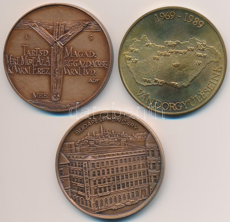 Description: Bognár György (1944-) 1989. "MÉE 20 éves / Vándorgyűléseink" aranyozott Br emlékérem (42,5mm) + Fritz Mihály (1947-) 1990. "50 éves a Technoimpex" Br emlékérem (42,5mm) + Kiss Sándor (1925-1999) 1988. "MÉE Budapest / Körösfő Református Templom" Br emlékérem (42,5mm) T:1-,2