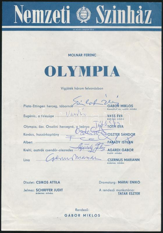 Gábos Miklós Kossuth -díjas, kiváló művész; Agárdy Gábor kiváló művész és más színművészek aláírása a Nemzeti Színház műsorlapján