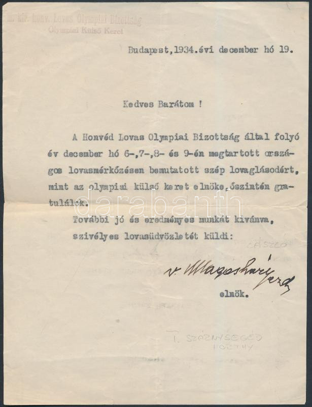 Description: 1934 Vitéz Magasházy László (1879-1959) tábornok, Horthy Miklós szárnysegédje, országgyűlési képviselő gratuláló levele szép lovaglásért, a Lovas Olympiai Bizottság pecséttel, és Magasházy saját kezű aláírásával