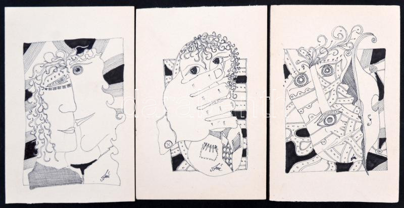 Szász jelzéssel: Arcok, 3 db kisgrafika, tus, papír, különböző méretbe...