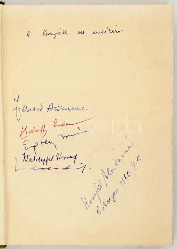 Description: Komját Aladár összegyűjtött művei. Bp., 1957. A szerző felesége, Komját Aladárné, valamint Jancsó Adrienne (1921-2006) Bánffy György (1927-2010) Keres Emil (1925) Egressy István rádióbemondó, Waldapfel József irodalomtörténész saját kezű aláírásával