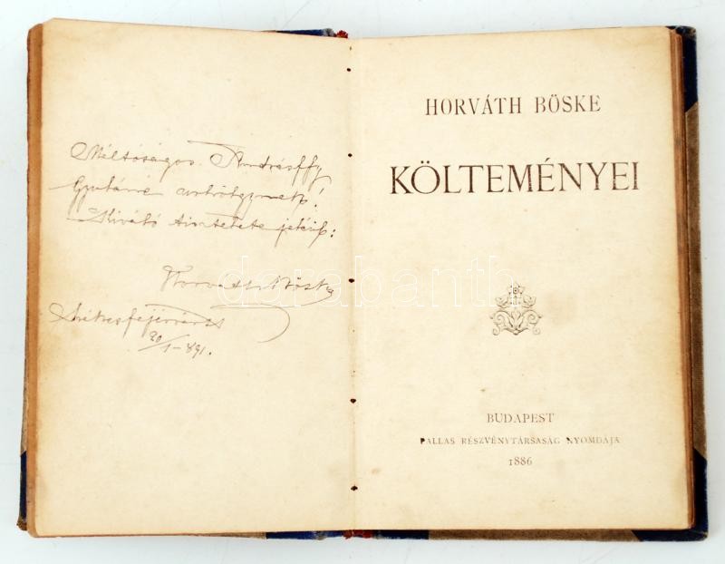 Horváth Böske költeményei. DEDIKÁLT! Bp., 1886, Pallas Részvénytársasá... https://www.darabanth.com/en/239-Online-auction/239.0/Other-collectibles/Books-Other-rarities~200041/Horvath-Boske-koltemenyei-DEDIKALT-Bp-1886-Pallas-Reszvenytarsasag-Nyomdaja-EgeszvC3~II1108367
