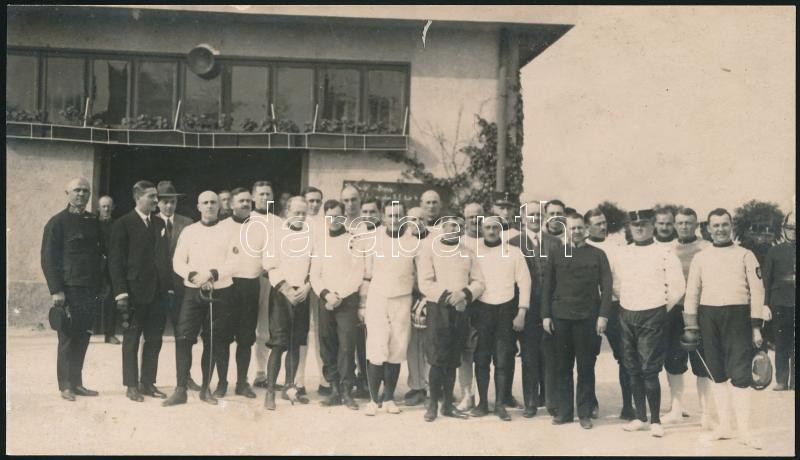 1927 IV. országos rendőrtiszti kardvívóverseny résztvevői, hátoldalon feliratozott csoportkép, 14x8 cm