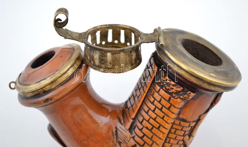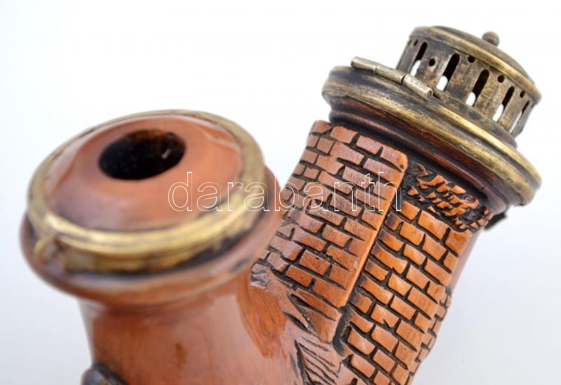 Description: Katonai motívumos tajtékkő pipa fém szerelékekkel, "1809"(?) felirattal, jelzett ("J. H.") kis kopásnyomokkal / Vintage pumice pipe with military motives m: 12,5 cm