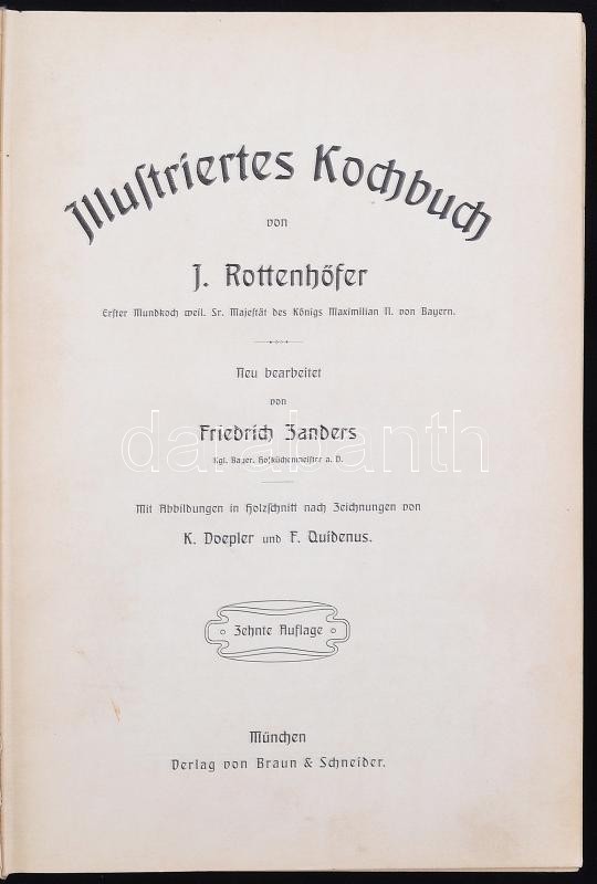 Description: Julius Rottenhöfer: Illustriertes Kochbuch. Zehnte Auflage. München, 1904, Braun und Schneider. 1222 p. Számos szövegközti fametszetes illusztrációval. Kiadói, díszesen aranyozott vászonkötésben. A borító tábla szélein a vászon kissé sérült, de egyébként jó állapotú kötet.