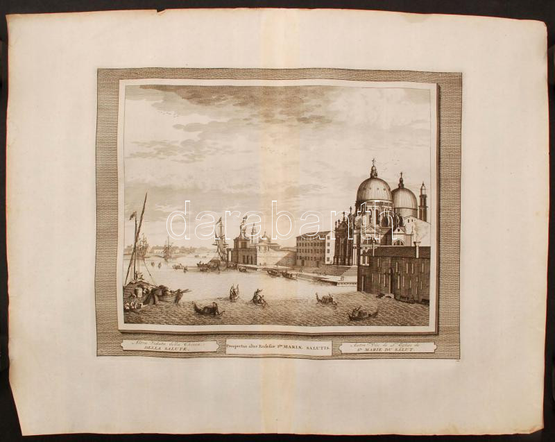 cca 1715-1750 Domenico Lovisa (1690 k.-1750 k.): Altra veduta della chiesa della Salute, a velencei Santa Maria della Salute-templom, rézmetszet, papír, a szerző Il gran teatro di Venezia c. munkájából, olasz, latin és francia nyelven feliratozva, 28×34,5 cm / cca 1715-1750 Domenico Lovisa (cca 1690-cca 1750): Altra veduta della chiesa della Salute, the Santa Maria della Salute church in Venice, copper etching, paper, from the author's Il gran teatro di Venezia, with notes in Italian, Latin and French, 28×34,5 cm