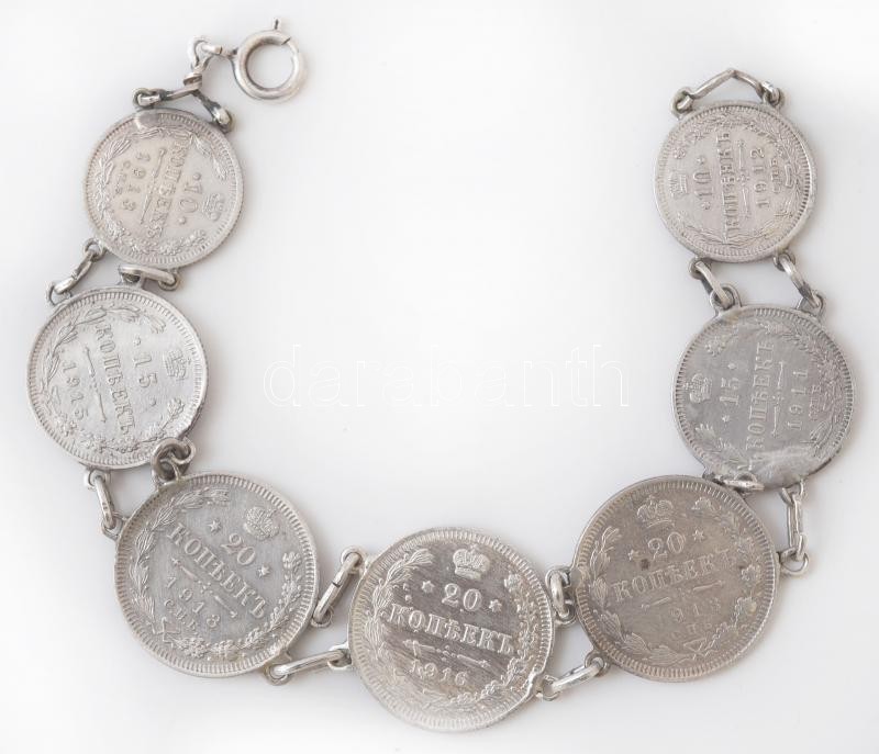 cca 1910-1916 Orosz ezüstpénzekből készült ékszer szett. Karlánc, medá...