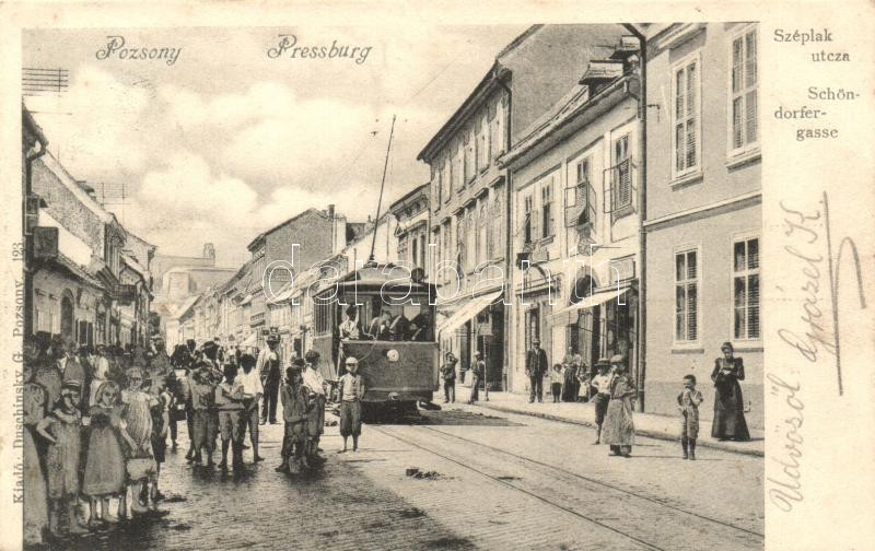 Pozsony, Pressburg; Széplak utca villamossal, Schöndorfer utca; kiadó ...
