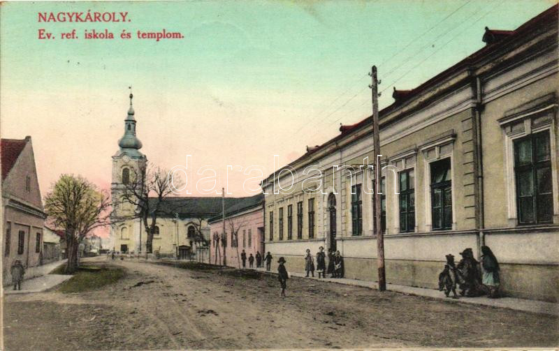 Nagykároly, Református iskola és templom. Csókás László kiadása / church, school