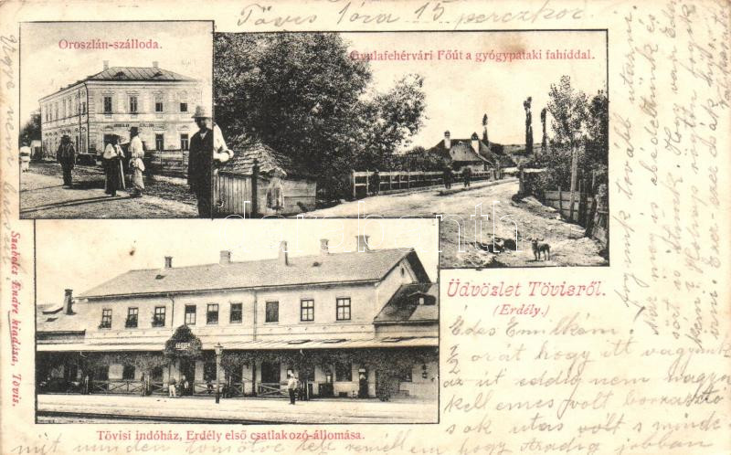 Tövis, Oroszlán szálloda, Gyulafehérvári Főút, vasútállomás. Szabolcs Endre kiadása / hotel, railway station
