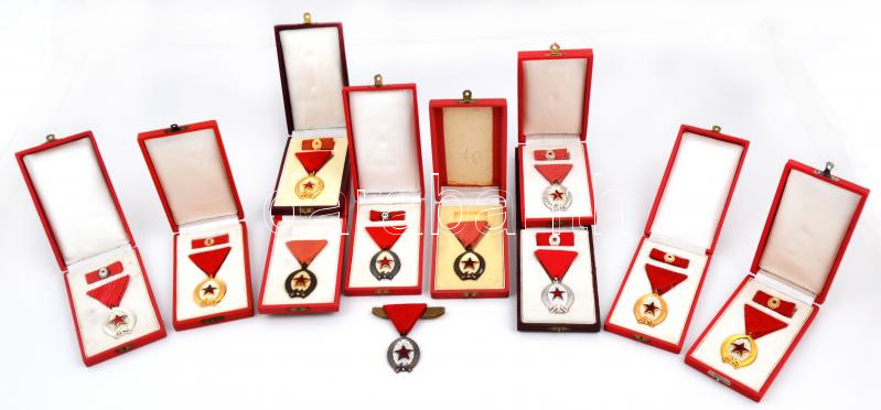 Description: 1964-1985. "Munka Érdemrend" arany (4x), ezüst (5x) és bronz fokozata (2x), zománcozott Br kitüntetések mellszalagon, többnyire szalagsávon miniatűrrel, egy kivétellel eredeti dísztokokban T:1-,2