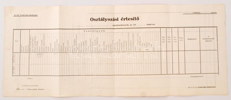 cca 1920-1930 A M. kir. Ludovika Akadémia osztályozási értesítője, kit...