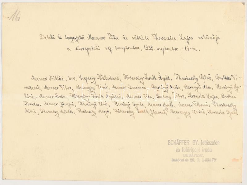 1938 Deteki és tengerfalvi Menczer Zita és rétháti Kovacsics Lajos esküvője Schäffer fotó, hátoldalt a díszes vendégsereg felsorolásával
