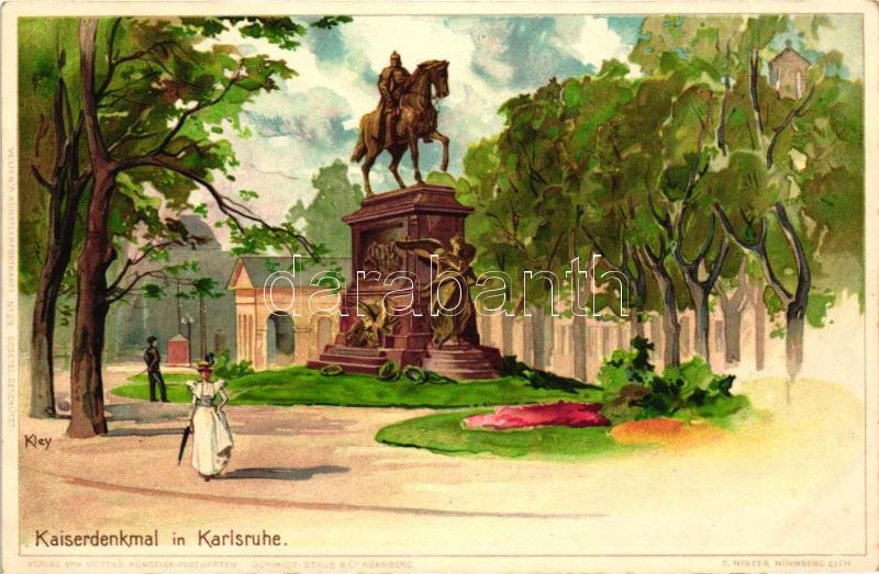 Karlsruhe, Kaiserdenkmal / statue, Velten's Künstlerpostkarte No. 29. litho s: Kley