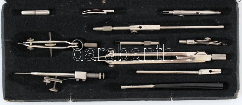 Turán írószer körzőkészlet, kopott tartóban, teljes, az egyik elem kic...
