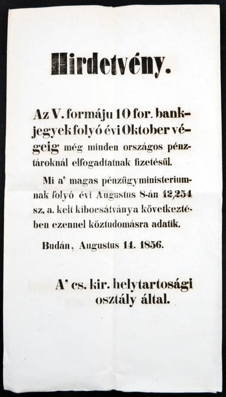 Buda 1856. "A császári királyi helytartósági osztály" által kiadott hirdetmény az "V. formáju 10 for." bankjegyekről, német és magyar nyelven