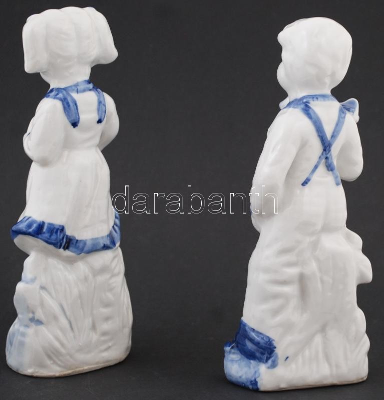 Kisfiú és kislány, 2 db porcelán szobor, kézzel festett, jelzés nélkül, kis kopásnyomokkal, m: 20 cm