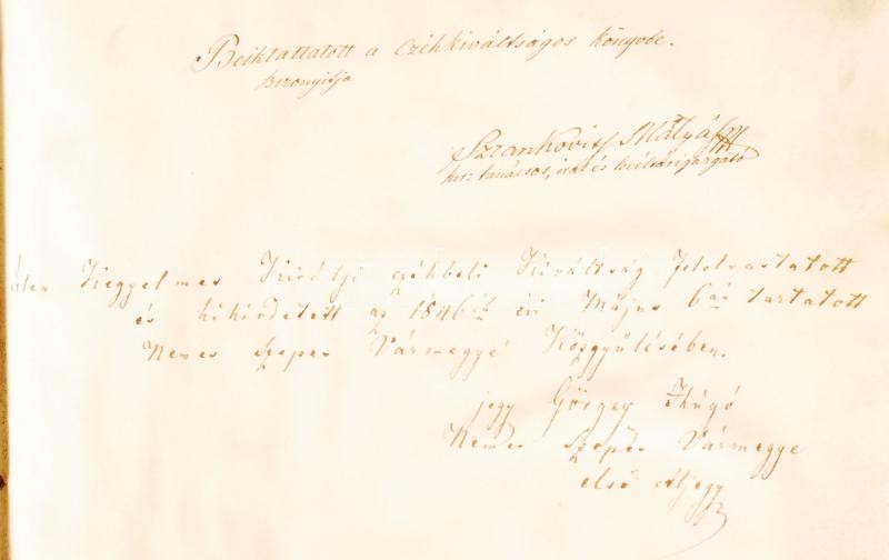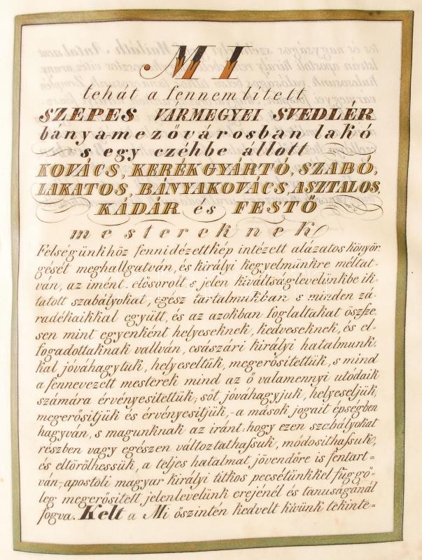1845 I. Ferdinánd által kibocsájtott kiváltságlevél a Szepes vármegyei Svedlér bánya-mezÅ‘városában lakó egy czéhbe állott kovács, kerékgyártó, szabó, bányakovács, asztalos, kádár és festÅ‘ céhnek. Magyar nyelven kézzel Ãrt bevezetÅ‘vel, nyomtatott cikkelyekkel 16 oldalon, kézzel Ãrott záradékkal két oldalon, valamint Ferdinánd császár, gróf Mailáth Antal kancellár, Jászay Pál (1809-1852) történész, oklevélkutató saját kezű aláÃrásával. Az utolsó oldalakon kihirdetési záradékokkal. Réztokban függÅ‘ viaszpecséttel, bársony borÃtással. Csak két hártyapapÃr sérült, egyébként szép állapotban. /