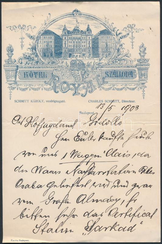 1903 A Budapesti Royal szálloda fejléces papírja rajta udvari vadászat...