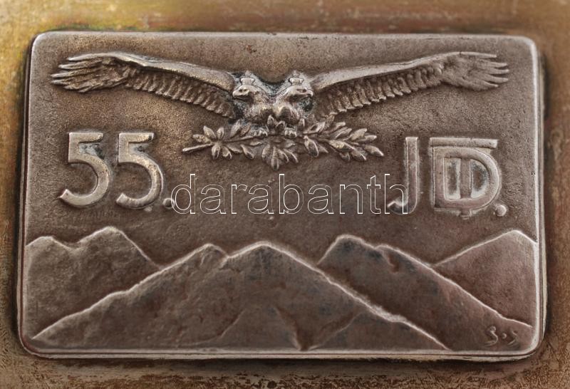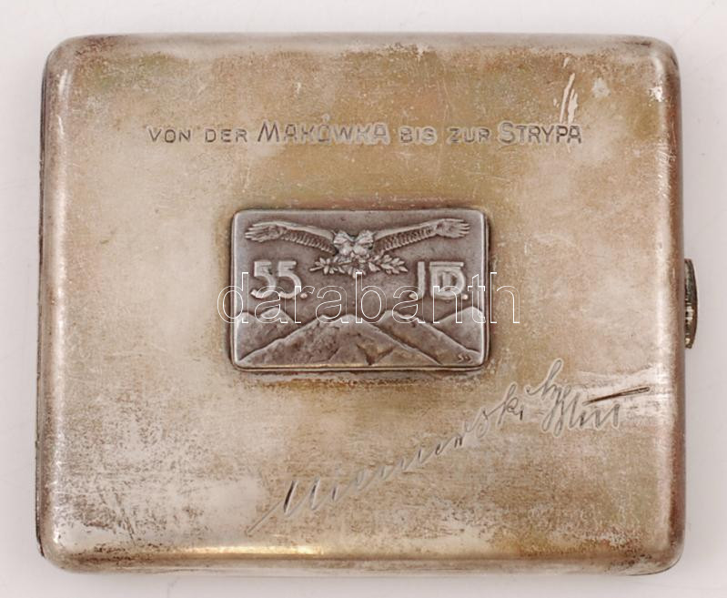 Description: Ezüst (Ag.) cigarettatárca, jelzett osztrák címeres mini plakettel, "Von der Makówka bis zur Strypa" felirattal, gravírozott, jelzett, 8×9 cm, bruttó: 149 g