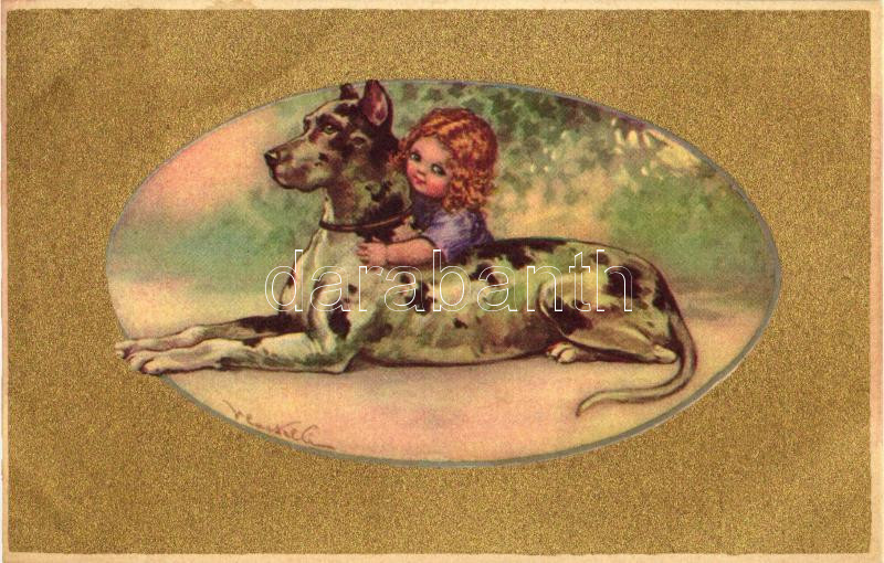 Italian golden art postcard, girl with dog, Anna & Gasparini 108-1...