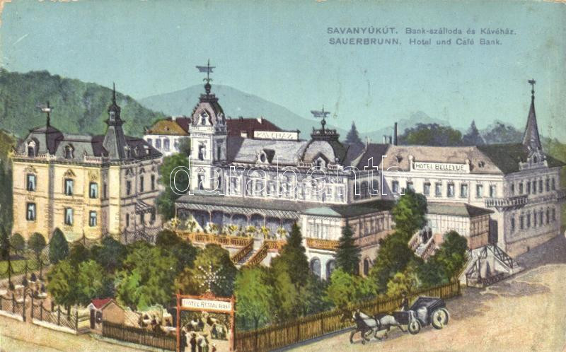 Savanyúkút, Sauerbrunn; Bank és Bellevue szálloda, Kávéház / hotels, c...