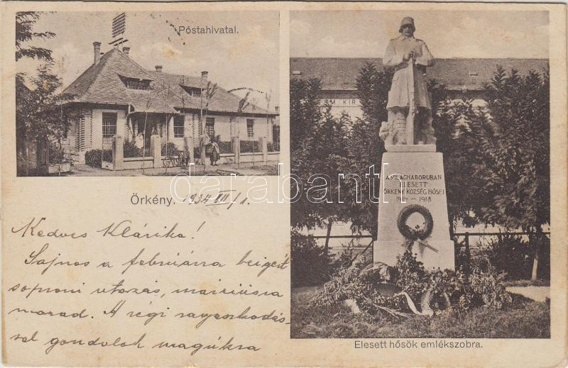Örkény, Elesett hősök emlékszobra, postahivatal (vágott / cut)