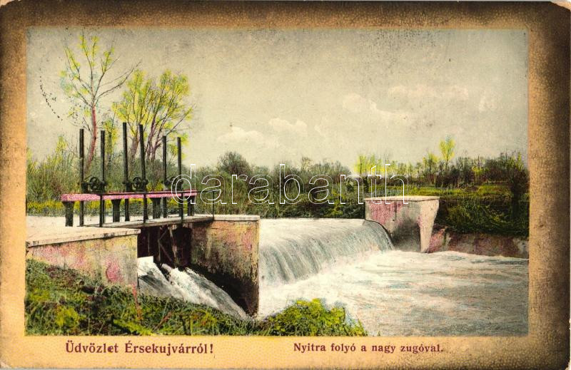 Érsekújvár, Nyitra folyó, Nagy Zúgó; kiadja Winter Emil / river, dam ...