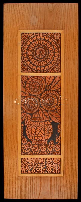 Jelzett iparművészeti alkotás, metszett réz falikép, fa lemezen, 36×11...