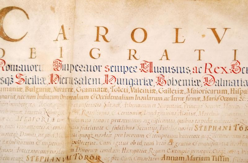 VÉDETT!! 1718 III. Károly magyar király címereslevele Török István és felesége, Tissin Annamária, fiai, József és Imre valamint lányai, Katalin és Franciska részére. Az oklevél elején ép, festett címerképpel, kék-sárga-vörös-fehér sodratú fatokos uralkodói függőpecséttel, a plicán kihirdetési záradékkal. Több helyütt restaurált, de megviselt állapotban, elhalványodott szöveggel, szakadásokkal, penészfoltokkal. / PROTECTED BY THE HUNGARIAN CULTURAL HERITAGE OFFICE