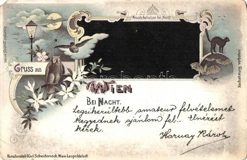 1898 Vienna, Wien; bei Nacht / at nightowl, bats, cat, moon, Kunstanstalt Karl Schwidernoch No. 400. floral litho (EM)